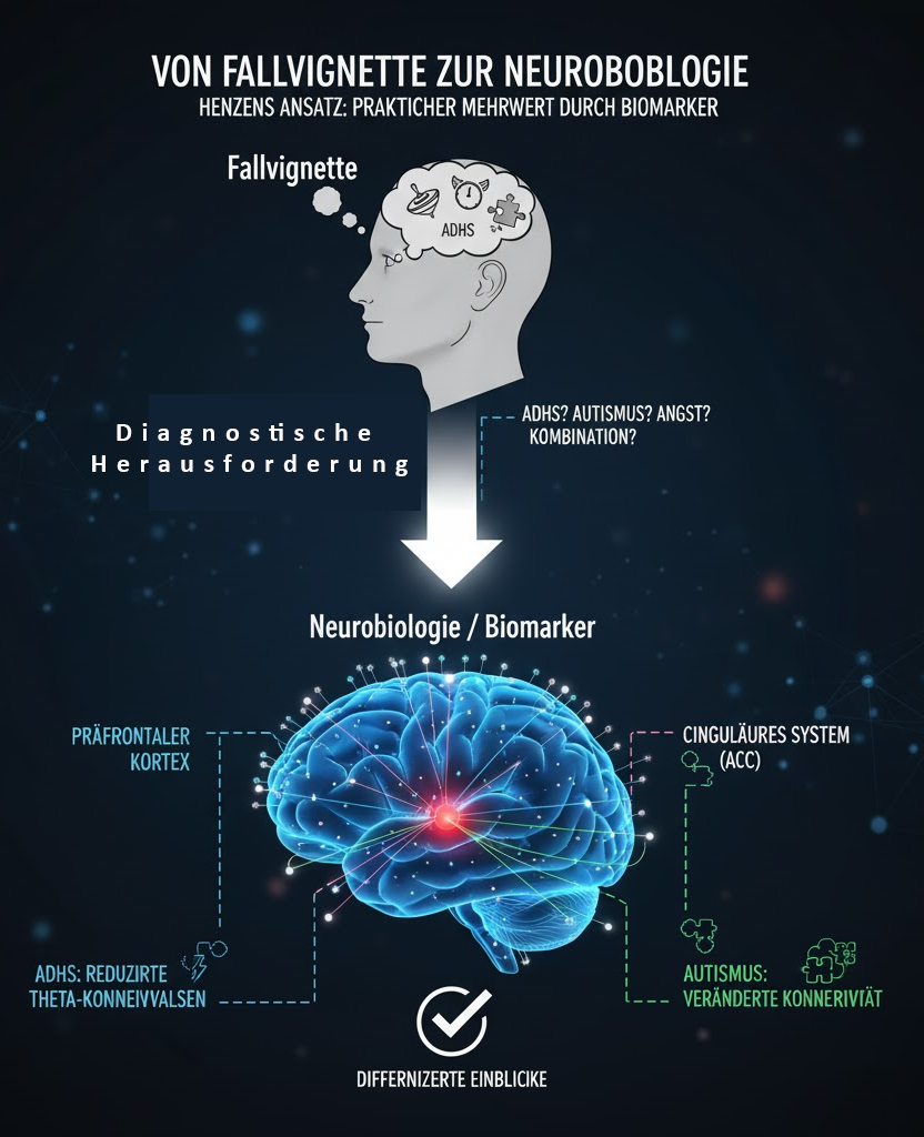 Henzens Ansatz, von konkreten Fallvignetten ausgehend die neurobiologischen Mechanismen zu erschliessen, verkörpert den Kern der Biomarker-Integration in die klinische Praxis. Die diagnostische Herausforderung in der Erwachsenenpsychiatrie liegt oft in der Komplexität überlappender Symptome: Ist die ausgeprägte Reizüberflutung Ausdruck von ADHS, Autismus, einer Angststörung – oder einer Kombination?
