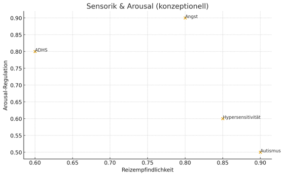 Abbildung 1: Verteilung der vier Störungsbilder auf der Dimension «Sensorische Verarbeitung & Arousal». Autismus zeigt die höchste Reizempfindlichkeit bei instabiler Arousal-Regulation, während ADHS eher moderate Sensitivität mit hohem (und oft auch tiefem Arousal kombiniert.