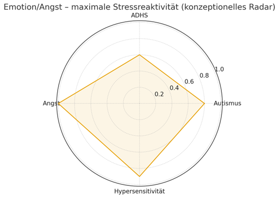 Abbildung 2: Die emotionale Dimension zeigt Angststörungen mit den höchsten Stresspeaks, gefolgt von Hypersensitivität. Autismus liegt im oberen Bereich, während ADHS eher moderate, breite Übererregung zeigt.
