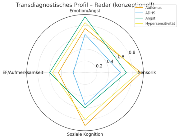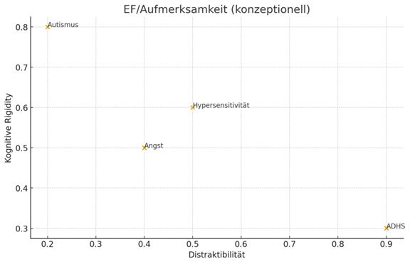 Abbildung 3: ADHS zeigt die höchste Ablenkbarkeit auf der EF-Dimension, während Autismus eher rigide Aufmerksamkeitsmuster aufweist. Angst und Hypersensitivität liegen im mittleren Bereich.