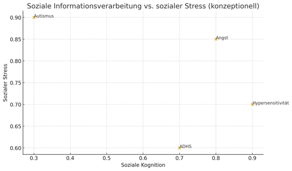 Abbildung 4: Autismus zeigt geringe soziale Kognition bei hohem sozialem Stress. Angst und Hypersensitivität haben intakte soziale Kognition, aber hohen sozialen Stress. ADHS liegt im Mittelfeld.