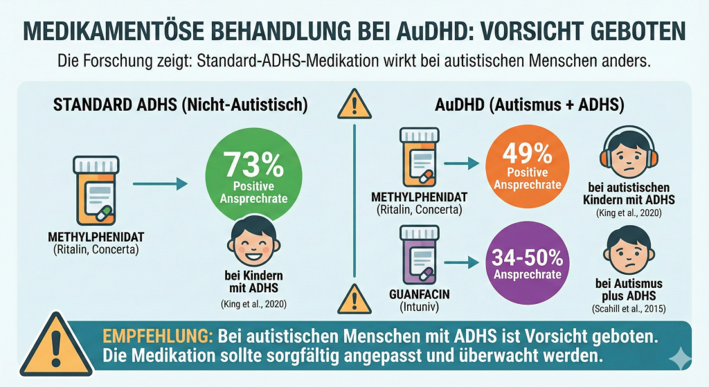 • Methylphenidat (Ritalin, Concerta): 73% positive Ansprechrate bei Kindern mit ADHS, aber nur 49% bei autistischen Kindern mit ADHS (King et al., 2020)
